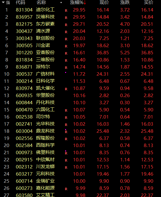 化工股本日也全体大涨,迪尔化工、汉维科技30%涨停,净水源、联创股份、川金诺等20cm封板,川发龙蟒、嘉化动力、三维化学等超30股涨停或涨超10%。