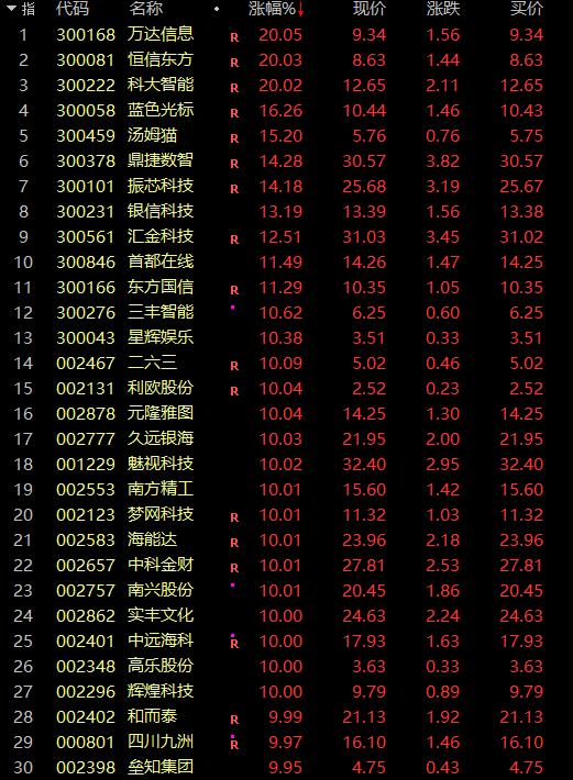 热门方面,东说念主工智能宗旨全线大涨,板块指数放量上攻涨逾3%。板块内个股掀翻涨停潮,万达信息、恒信东方、科大智能20%涨停,二六三、中科金财、利欧股份、实丰文化等超30股涨停或涨超10%。